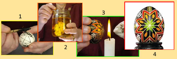 - beeswax — designs are written on the egg with melted beeswax; the beeswax resists the colours of the dye