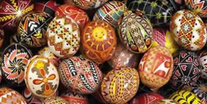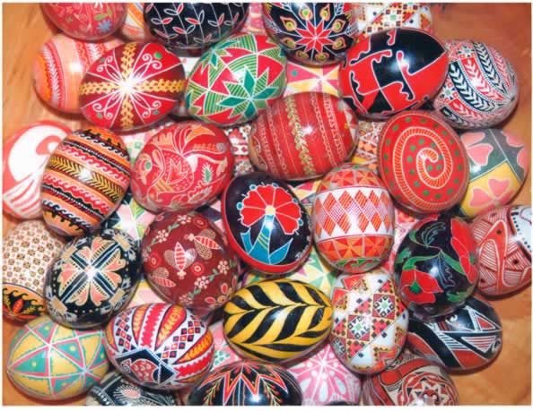 A sun motif dominates this colourful display of pysanky Ukrainian Easter eggs made the traditional way with beeswax, kistka and dyes
