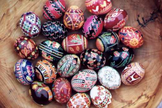 Pysanky are the colourful decorated eggs made with beeswax and dyes in a technique akin to batik. The tradition started in Ukraine in ancient pagan times. The name pysanky (singular pysanka) is derived from the Ukrainian verb pysaty – to write. It is pronounced PIH-sahn-kih (with the emphasis on the first syllable “PIH”). Similarly, the singular decorated egg is the word “pysanka” and it is pronounced PIH-sahn-kah.